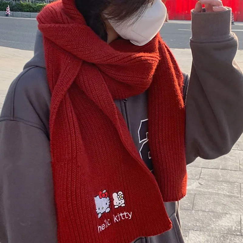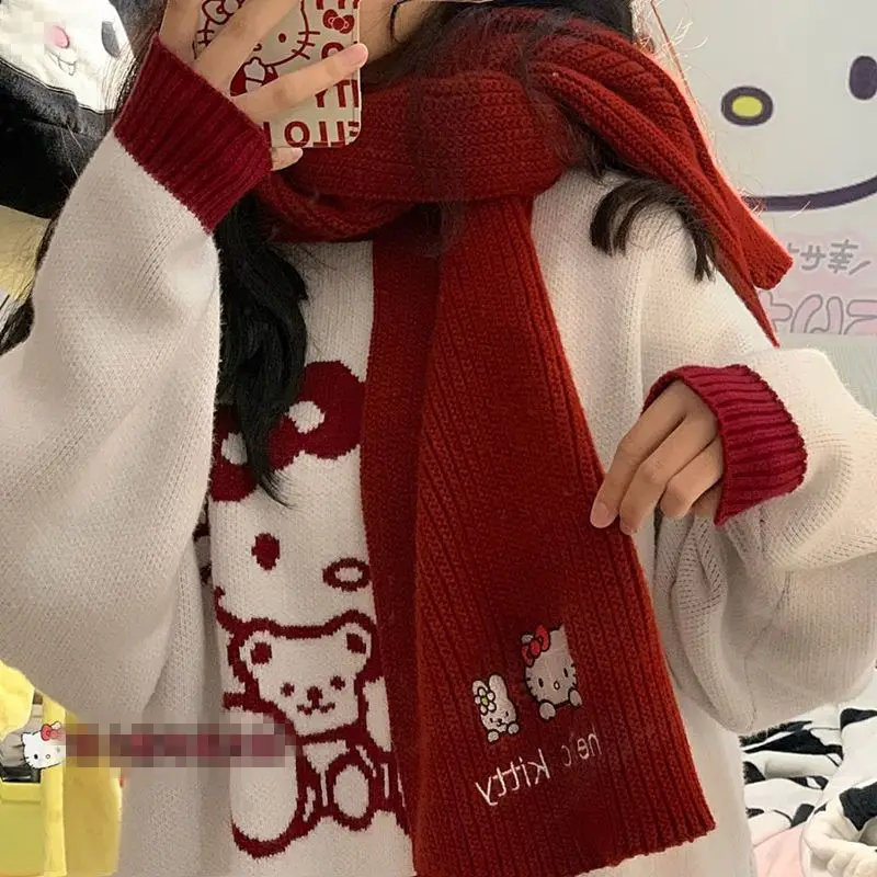 Hello Kitty Knit Scarf Anime Sanrios Kuromi My Melody Cinnamoroll Doll Cute Scarf Women Warm Embroidery Neckwear Y2k Style Shawl Aliexpress